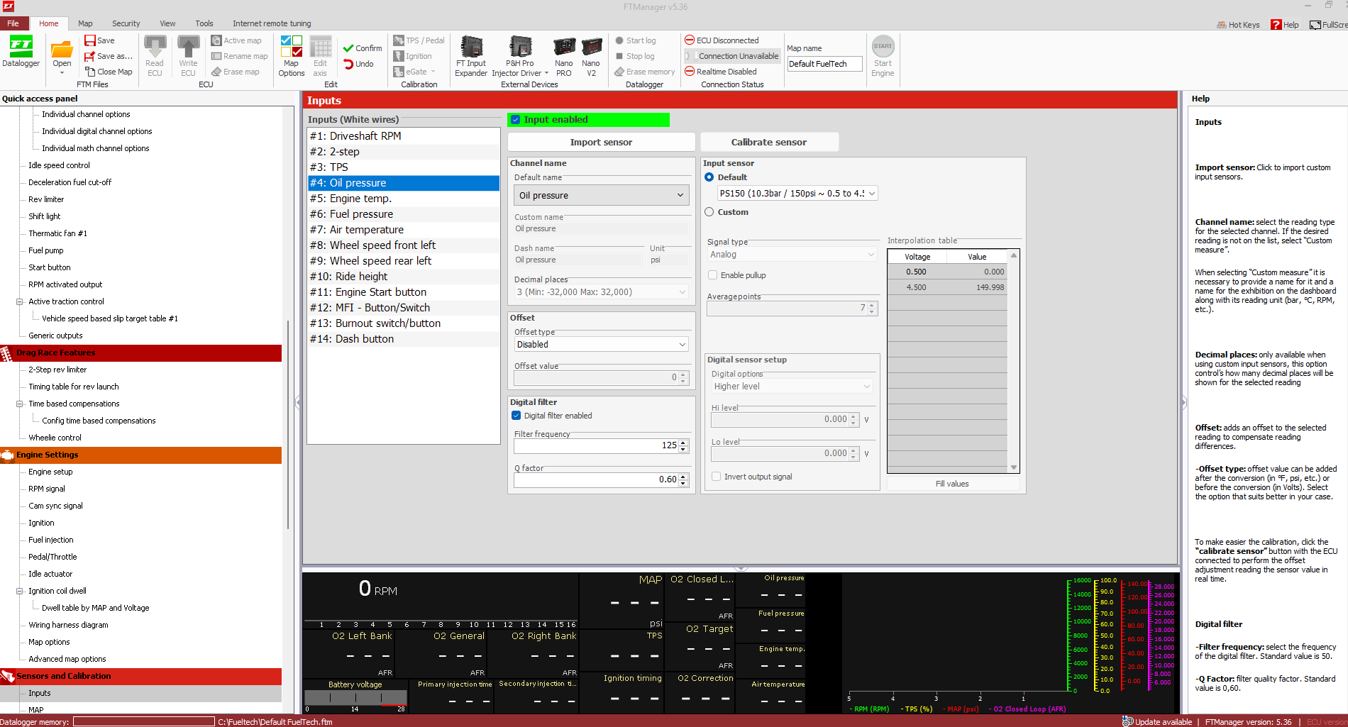 ECU configuration for the FuelTech 0-150 PSI sensor is very straightforward and identical to the Fuel Pressure Sensor setup. Follow the steps below and select the predefined sensor configuration.